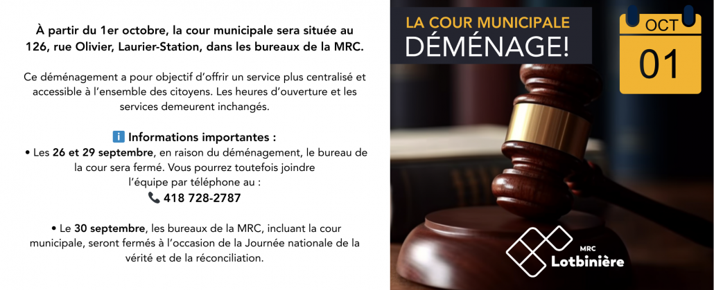 Pour toute information supplémentaire, vous pouvez aussi nous écrire par courriel à l’adresse électronique suivante : cour.municipale@mrclotbiniere.org