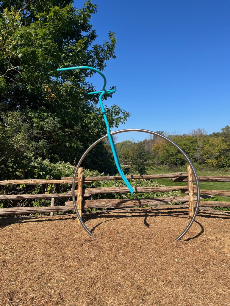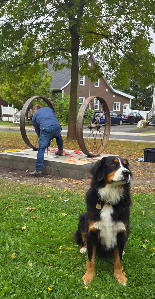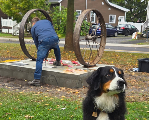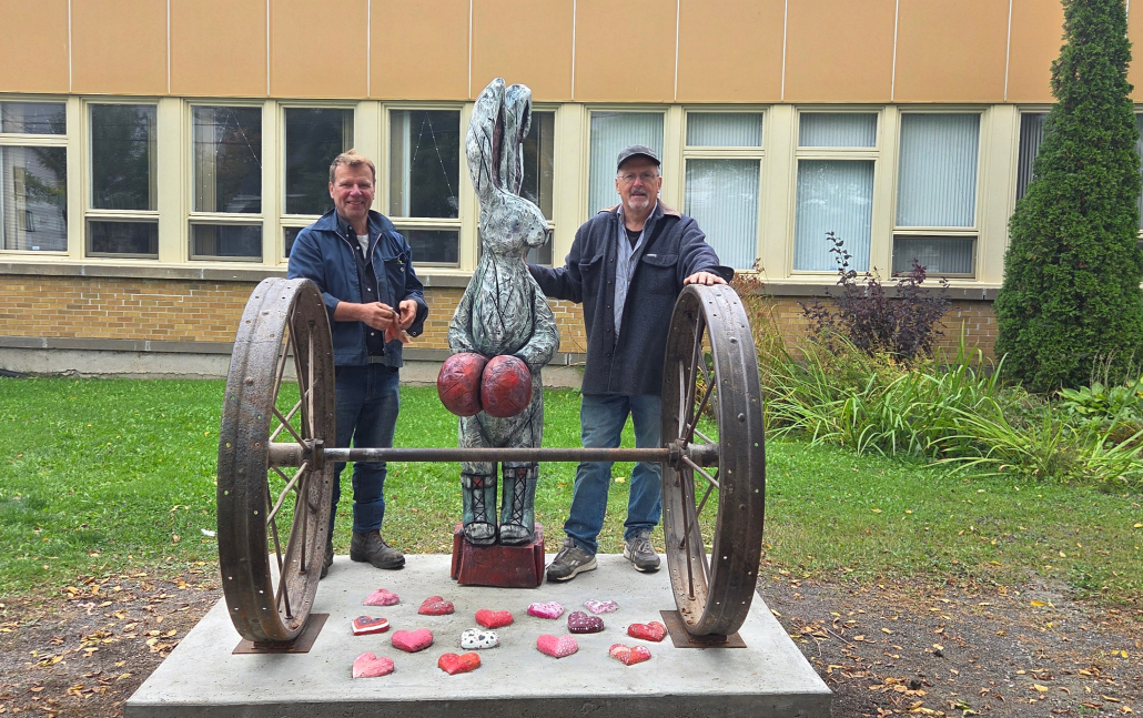 Ce collectif d’artistes est composé de Jean-François Maheux et Nadia Mercier. Leur œuvre, « CYCLO », se veut à la fois accessible, ludique et poétique, rappelant la partie avant d’un ancien vélo démesuré. Réfléchie pour s’implanter sur le site d’une future halte-vélo, l’œuvre entrera ainsi en relation avec son environnement. Grâce à sa grande dimension, elle pourra être admirée à distance par les cyclistes et les passants, mais également appréciée de près par ceux qui souhaiteront s’y attarder. Le public pourra alors y découvrir des textes originaux gravés sur le pourtour de la roue. Ces écrits, réalisés grâce à la participation citoyenne, dynamisent l’œuvre en créant un visuel unique et significatif.