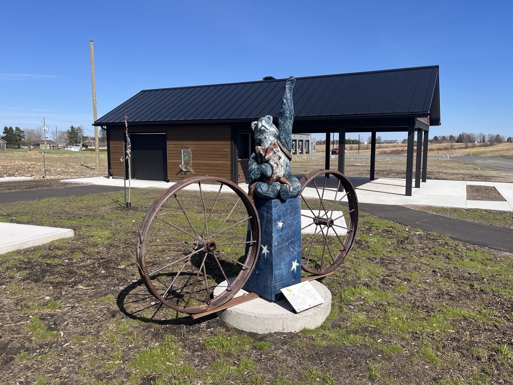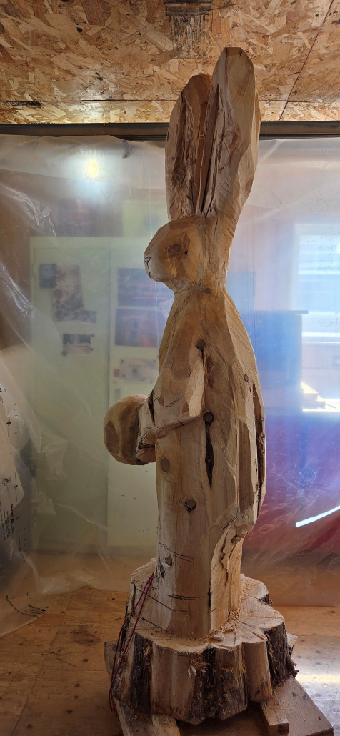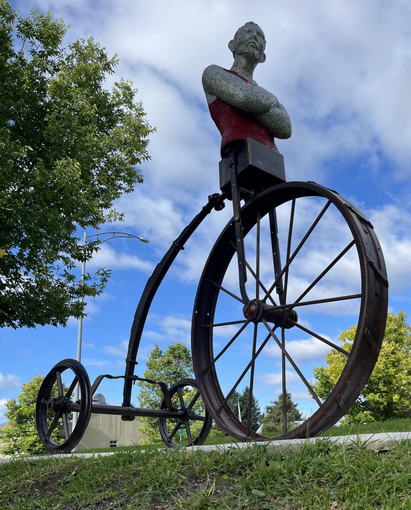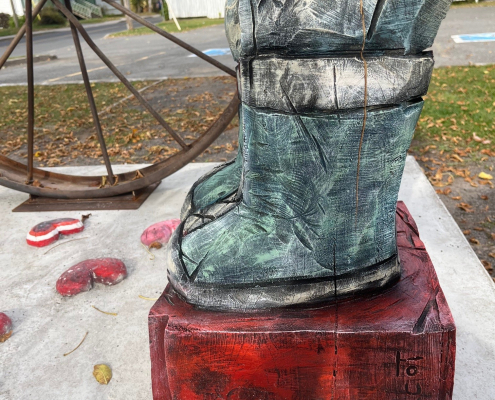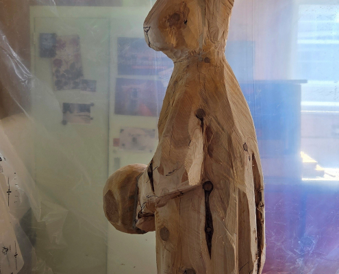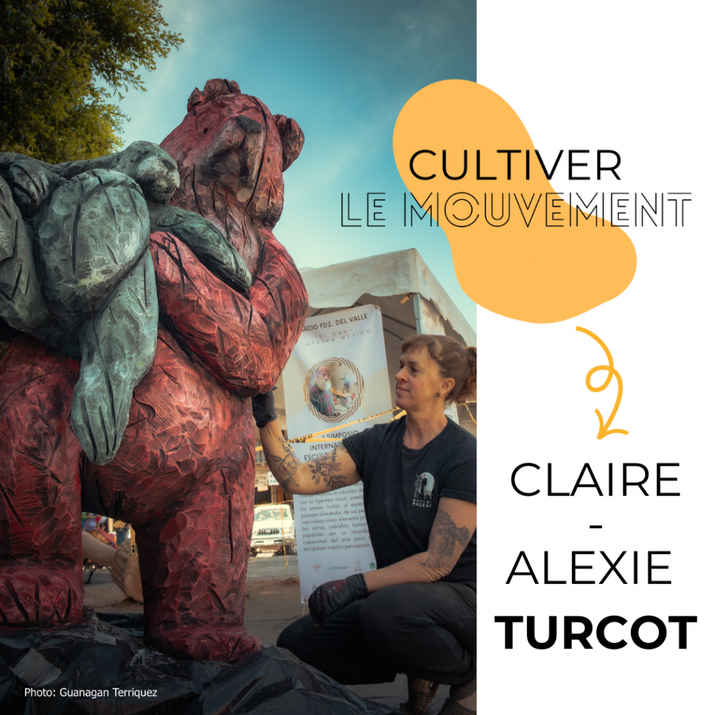 Dans le bois, Claire-Alexie sculpte des animaux colorés. Avec le temps, sa relation avec la précarité de la biodiversité a pris une place majeure dans son travail. Son sentiment d’impuissance à la protéger se reflète dans les sujets qui l’animent. Il en résulte des œuvres composées d’un mélange de douceur, d’urgence, d’espoir candide, de tragique et d’humour. Pour ce projet, elle a été inspirée par le sentiment de liberté que procure le vélo. La sculpture représente le duo improbable d’un ours et d’un renard à vélo, réunis au sommet d’une montagne pour partager un moment de pur bonheur sous les étoiles… Une œuvre positive et poétique qui donne envie de profiter de la nature et de sa beauté!