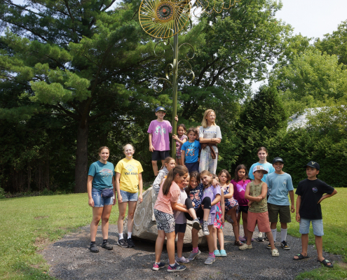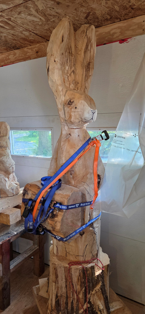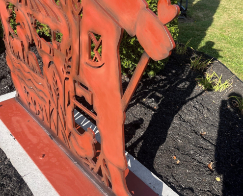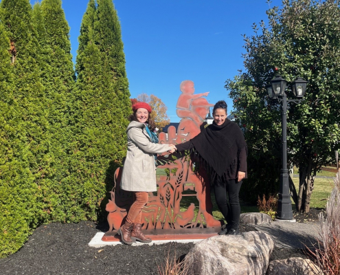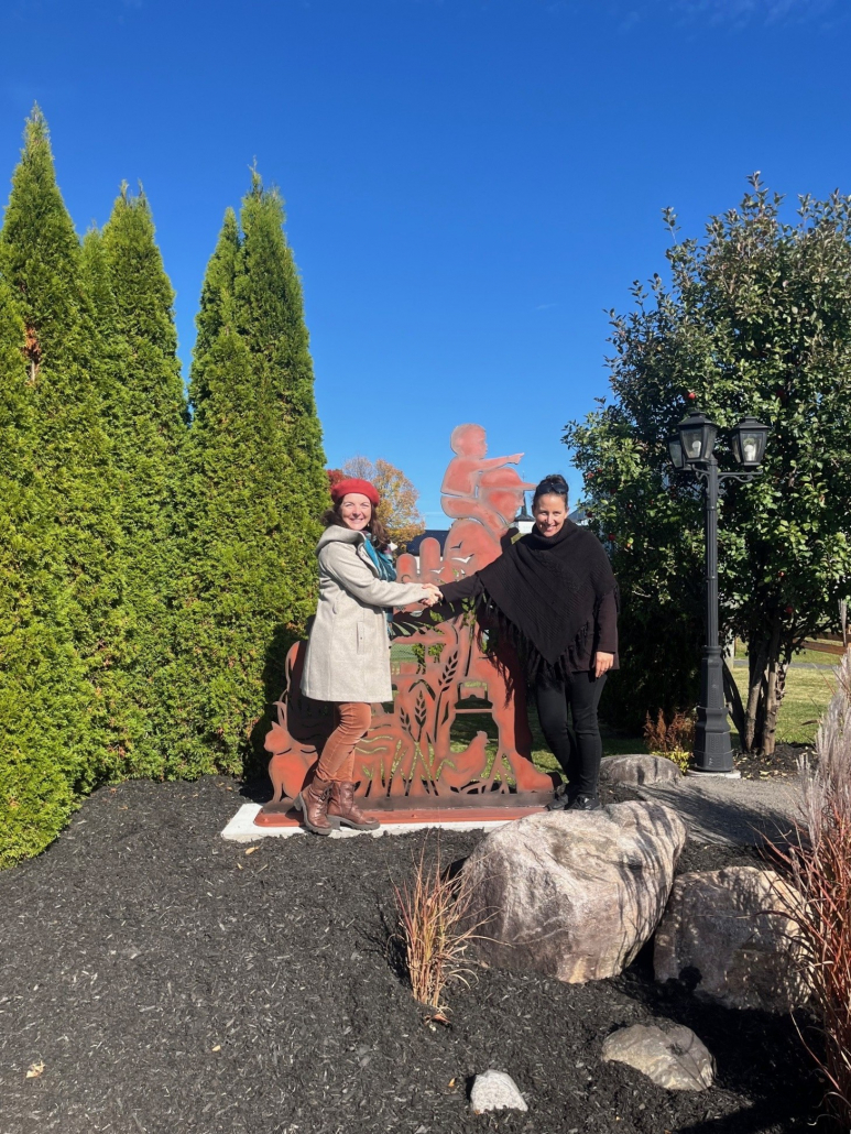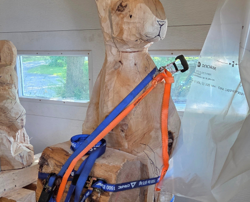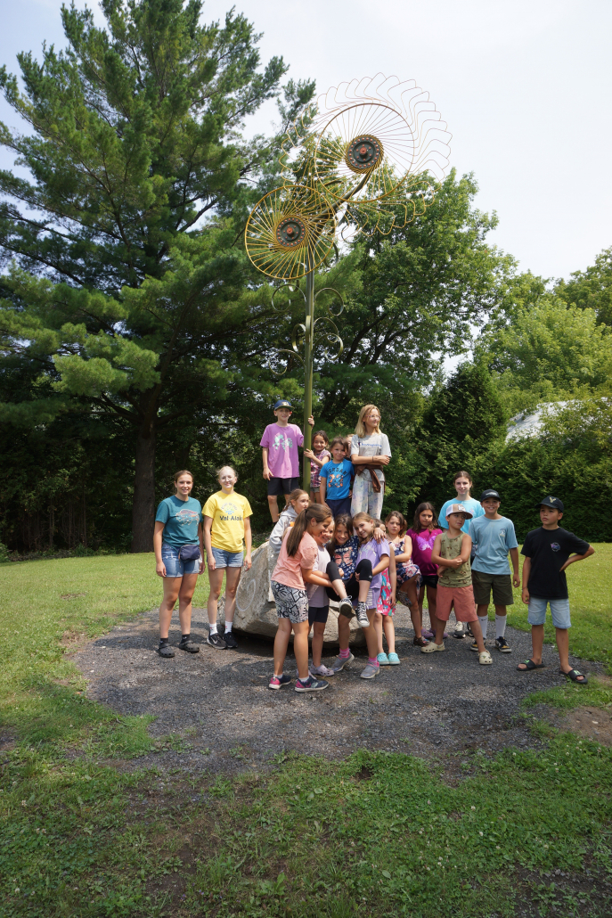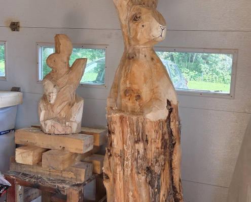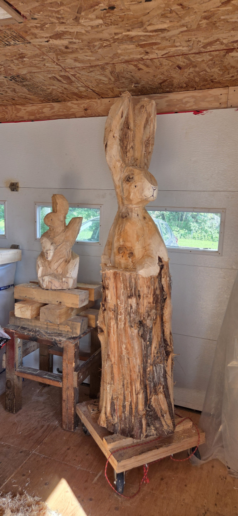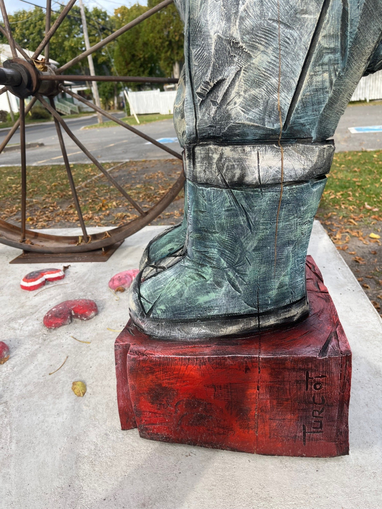 Dans le bois, Claire-Alexie sculpte des animaux colorés. Avec le temps, sa relation avec la précarité de la biodiversité a pris une place majeure dans son travail. Son sentiment d’impuissance à la protéger se reflète dans les sujets qui l’animent. Il en résulte des œuvres composées d’un mélange de douceur, d’urgence, d’espoir candide, de tragique et d’humour. Pour ce projet, elle a été inspirée par le sentiment de liberté que procure le vélo. La sculpture représente le duo improbable d’un ours et d’un renard à vélo, réunis au sommet d’une montagne pour partager un moment de pur bonheur sous les étoiles… Une œuvre positive et poétique qui donne envie de profiter de la nature et de sa beauté!
