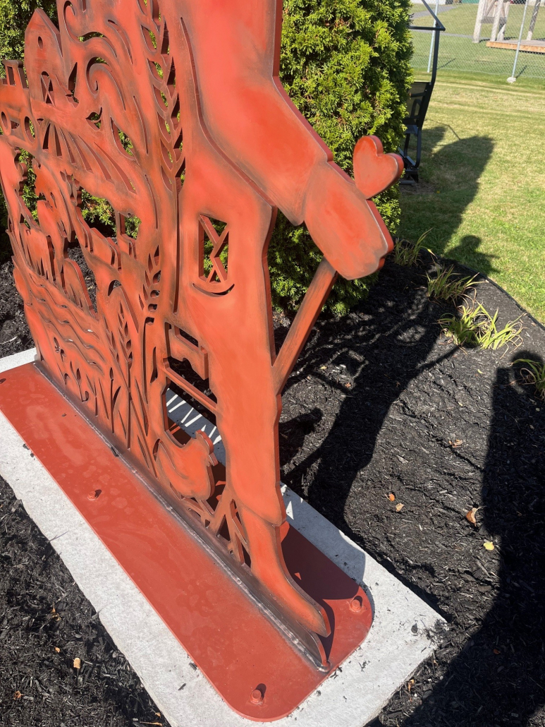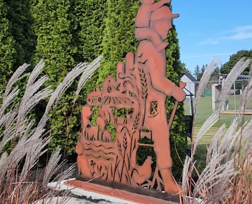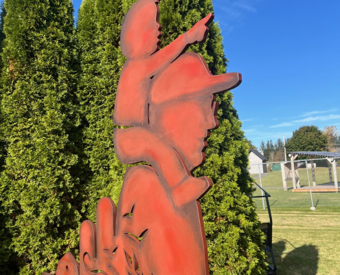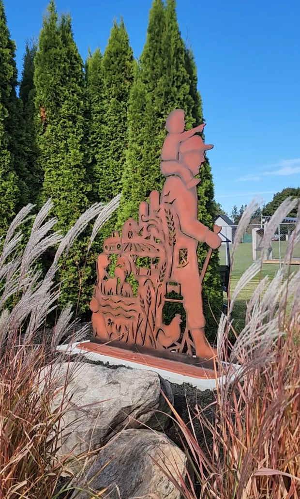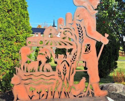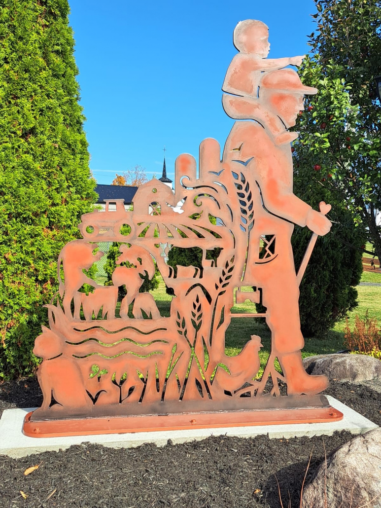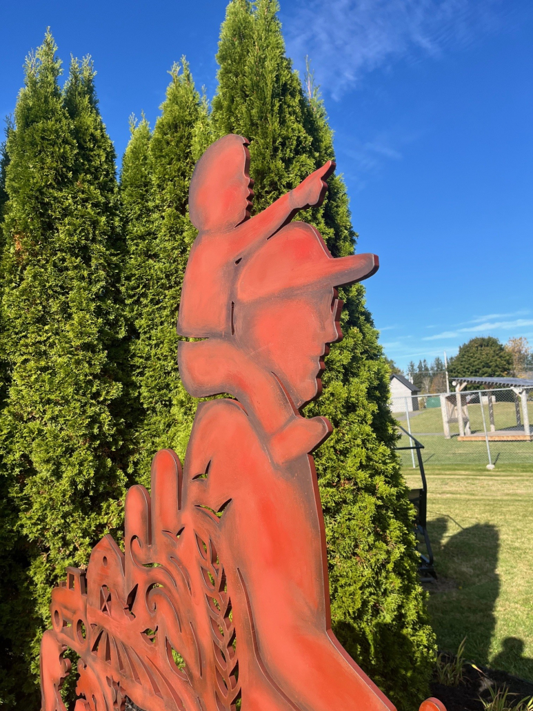 Cette œuvre ludique et à échelle humaine rend hommage aux racines rurales et aux valeurs cultivées dans la famille de l’artiste, d’origine française. Le décès soudain de son père agriculteur lui inspire cette scène : figer dans l’éternité sa silhouette portant sur ses épaules son fils d’un an.