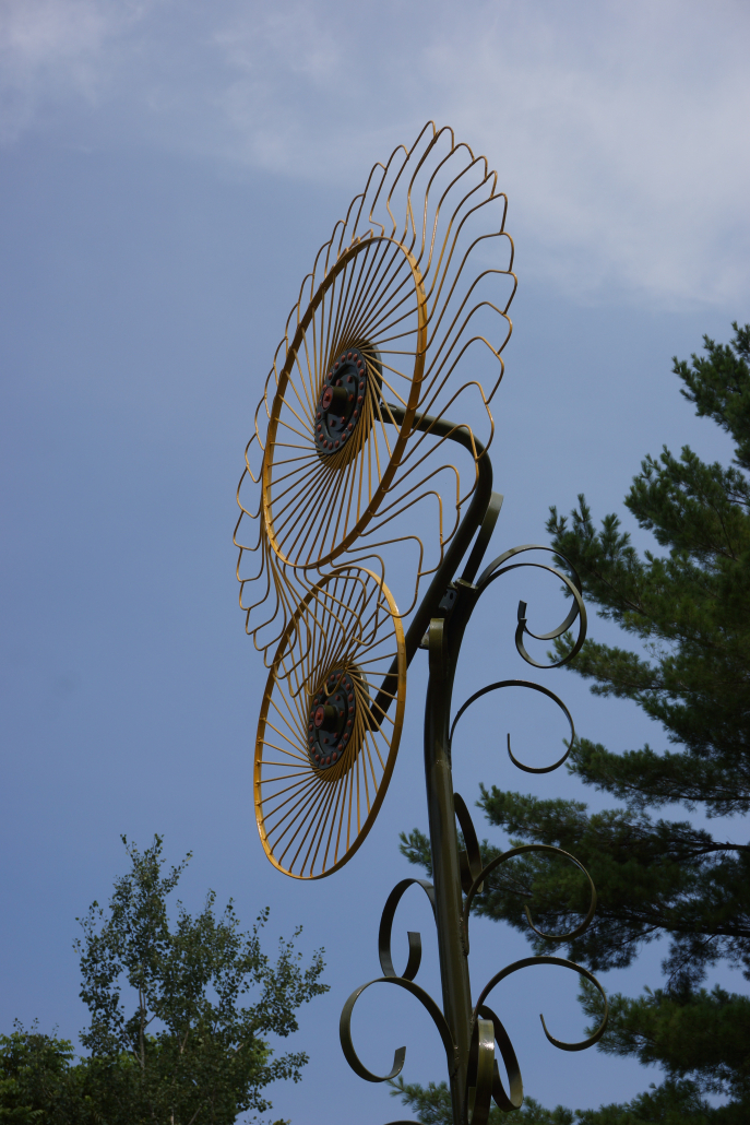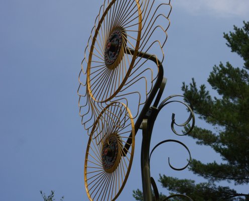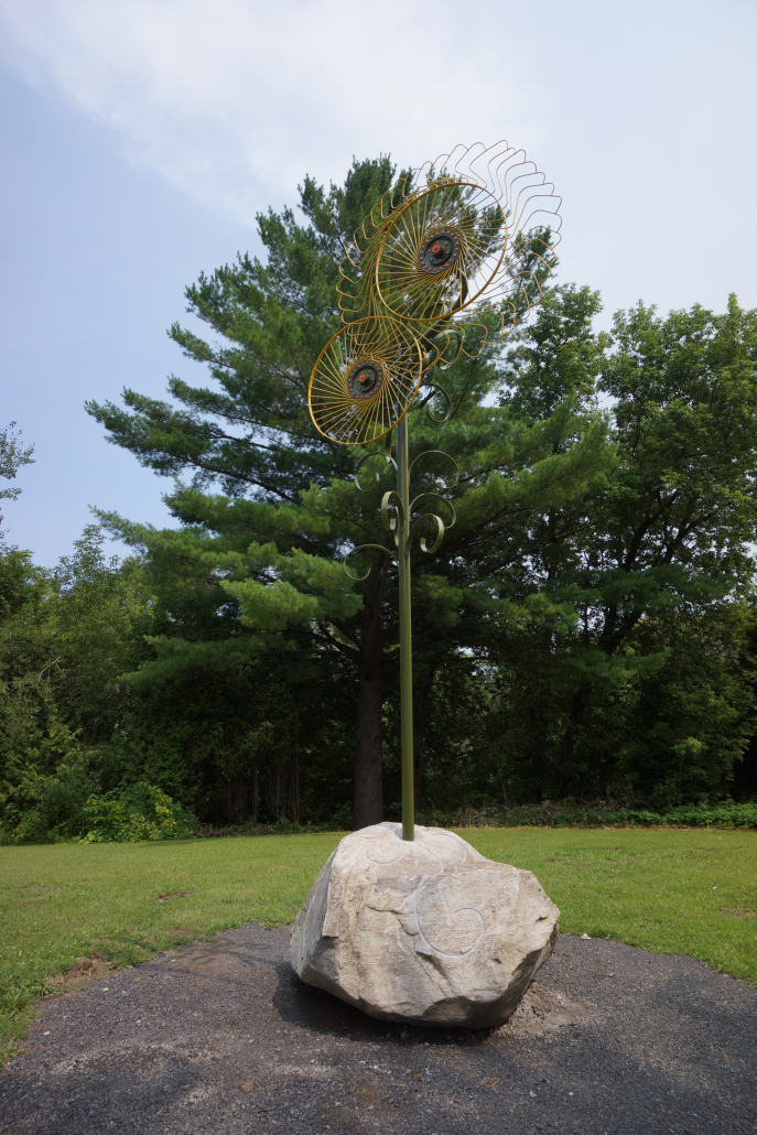 Par la nature de leurs formes, ces pièces issues de machines agricoles (râteau-soleil, herse) se métamorphosent en fleurs qui se déploient à partir d’une roche sur laquelle sont gravés les motifs de leur feuillage, évoquant la répétition phénoménale annuelle des récoltes où la vigueur végétale et l’intervention humaine se côtoient.