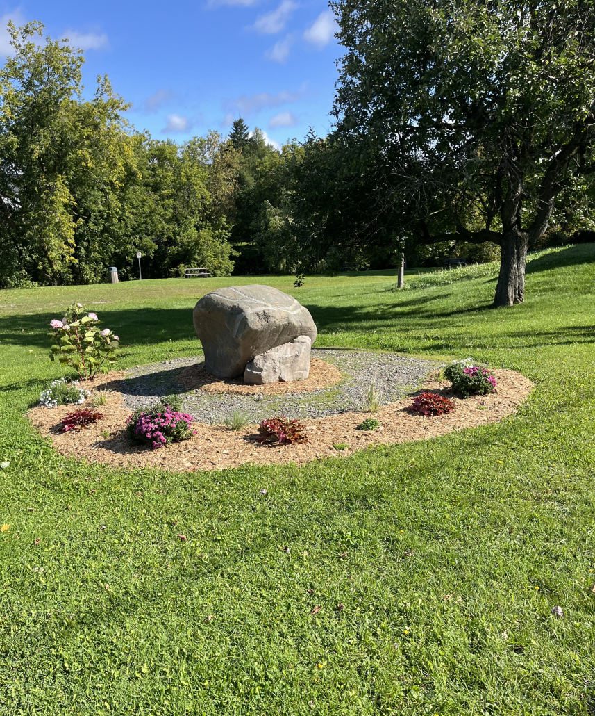 En lien avec la rivière et positionnée dans l’axe de sa cascade, cette pierre marquée de sillons rappelant un relevé topographique est gravée de motifs inspirés d’empreintes de pneus de vélo. Vue de près, l’œuvre invite au toucher et révèle des traits esquissés de projets parcourant de nouveaux sentiers.
