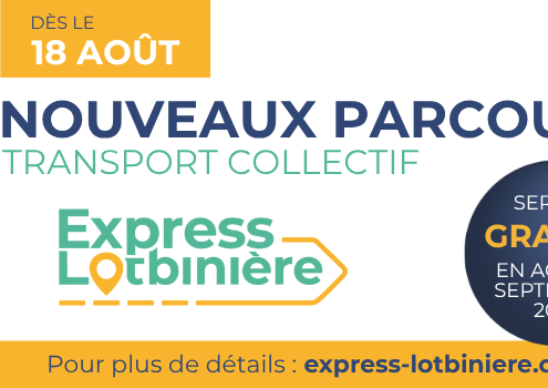 Laurier-Station, le 15 septembre 2025 – Afin de permettre à un plus grand nombre d’usagers de découvrir et d’utiliser les nouveaux services de transport collectif mis en place le 18 août dernier, la MRC de Lotbinière est heureuse d’annoncer…